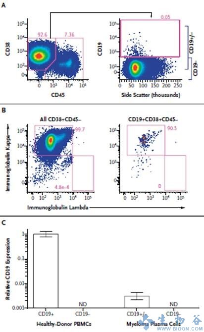 以患者接受自體移植前作為基線進(jìn)行骨髓穿刺,通過流式細(xì)胞術(shù)來分析多發(fā)骨髓瘤中CD19的表達(dá)??梢源_定在漿細(xì)胞瘤中以CD38+ CD45-免疫表型和kappa 輕鏈限制性占主導(dǎo)地位(圖3)。多發(fā)性骨髓瘤漿細(xì)胞群體中CD19僅占0.05%(圖3A)。微量的CD19+亞群表達(dá)細(xì)胞內(nèi)kappa輕鏈(圖3B)和B細(xì)胞成熟抗原(BCMA),這是漿細(xì)胞特異性標(biāo)志物(未示出),證實(shí)了其作為惡性漿細(xì)胞群體的一部分。此外,在CD19+一個(gè)小亞群CD45+細(xì)胞中檢可識(shí)別到一小集群Kappa限制性漿細(xì)胞(圖4,陰影內(nèi)圖片)?;€骨髓樣本中其他的CD19+集群包含多克隆CD19 + CD20+ B細(xì)胞和小部分CD45 + CD38(陰性)+ CD20-CD19 +輕鏈陰性細(xì)胞,很可能是pro-B細(xì)胞或幼稚pre-B細(xì)胞(圖4)。為了更靈敏地鑒定CD19的表達(dá),我們使用FACS在CD19表達(dá)的2個(gè)閾值下對占主導(dǎo)的漿細(xì)胞集群進(jìn)行分選(圖3A),并且我們通過RT-PCR測定法分析了分選的漿細(xì)胞CD19信使RNA(mRNA)的存在。通過流式細(xì)胞術(shù)檢測99.95%骨髓瘤漿細(xì)胞為CD19陰性的細(xì)胞沒有檢測到CD19mRNA(圖3C)。