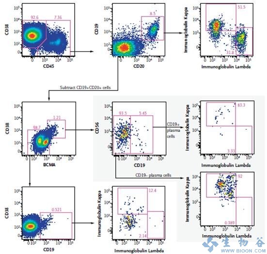 從圖3可以看出,移植前骨髓穿刺取樣經(jīng)流式細(xì)胞術(shù)分析表明,多發(fā)性骨髓瘤漿細(xì)胞群體特征除CD19+外CD38+CD45?占主要部分。分析前,通過設(shè)門排除雙峰,碎片,T細(xì)胞,單核細(xì)胞和死細(xì)胞(未示出)。CD45+細(xì)胞(上排,左圖)中發(fā)現(xiàn)含有以下CD19+細(xì)胞群:多克隆CD19+ CD20+ B細(xì)胞(最上面一排,中間和右側(cè)圖);一小部分漿細(xì)胞群體(BCMA+ CD38 +),是CD19+一個(gè)亞群并都具有kapaa限制性(陰影內(nèi)圖片),這表明它們是多發(fā)性骨髓瘤克隆的一個(gè)組份;以及一小群CD45+ CD38(陰性)+ CD20-CD19+細(xì)胞無免疫球蛋白輕鏈的表達(dá),最可能是pro-B細(xì)胞或幼稚pre-B細(xì)胞(第三行左側(cè)和中間圖)。BCMA表示B細(xì)胞成熟抗原。