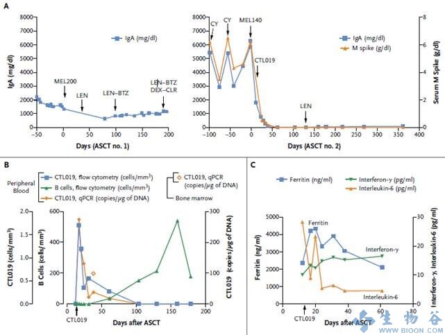 輸注后第2天到第47天(移植后第61天),通過流式細(xì)胞術(shù)(以0.3~1.7/立方毫米細(xì)胞數(shù)或0.1~0.2%外周血總T細(xì)胞數(shù))和定量PCR在輸在外周血中檢測CTL019細(xì)胞。在輸注后30天(移植后42天)用流式細(xì)胞術(shù)(0.1%T細(xì)胞)和定量PCR在骨髓中檢測到CTL019細(xì)胞,但在輸注后88天(移植后100天)消失(圖1B)。CTL019輸注后血清干擾素-γ和鐵蛋白上升,在輸注前血清IL-6濃度升高,并隨著體內(nèi)CTL019水平的降低而下降(圖1C)。炎癥標(biāo)志物沒有上升到之前使用CTL019引發(fā)的細(xì)胞因子釋放綜合征那樣的程度。正如預(yù)期,B細(xì)胞重建與檢測到的CTL019丟失相關(guān)。通常在多發(fā)性骨髓瘤患者接受自體移植后自體T細(xì)胞輸注后14天檢測到B細(xì)胞,早期的B細(xì)胞再生障礙可能是CTL019和馬法蘭共同作用而不是大劑量馬法蘭單獨(dú)作用。