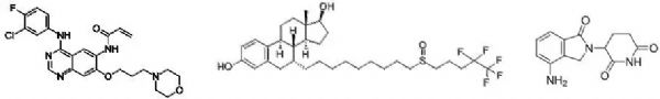 ▲Canertinib(左)、fulvestrant(中)和lenalidomide(右)分子結(jié)構(gòu)