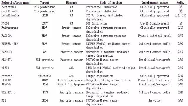 研究顯示,一些被用作抑制致癌蛋白活性的小分子藥物同時(shí)能夠促進(jìn)目標(biāo)蛋白的降解。比如說(shuō)canertinib是一個(gè)酪氨酸激酶ErbB-2的抑制劑,ErbB-2在多種癌癥內(nèi)有表達(dá),而canertinib可以增加ErbB-2的多聚泛素化以促進(jìn)其降解。ERα的抑制劑fulvestrant是另一個(gè)例子,它也可以促進(jìn)ERα的降解。在攜帶ERα的乳腺癌患者中,fulvestrant比另一個(gè)沒有促進(jìn)蛋白降解作用的ERα抑制劑tamoxifen的療效更好。對(duì)于急性早幼粒細(xì)胞白血病非常有效的藥物三氧化二砷,同樣可以促進(jìn)在該病患者中常見的融合致癌蛋白PML-RARα的降解。